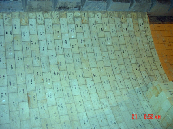 我公司提供专业的1000t/d、750t/d、600t/d活性石灰回转窑(包含预热器、回转窑、冷却器、溜槽小车、工艺管道、煤枪等设备全套耐火材料及施工总承包服务,具有丰富的活性石灰窑、轻烧窑、竖窑、水泥窑所用的全套耐火材料的研究、制造、安装、在线维保及技术改造经验。如图展示是我公司所承包的1000t/d活性石灰窑Φ4.88×71m回转窑预热带高铝砖的安装情形。整个回转窑筒体预热带采用了我公司生产的扬料预制砖(JG-80刚玉质增强型)沿圆周按60°均布,保温层采用了我公司生产的JNB-3节能保温砖,工作层采用了我公司生产的BG-70节能型高铝砖。